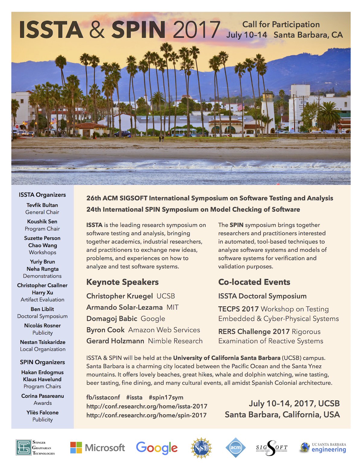 ISSTA 2017 will be held in Santa Barbara, California, USA, on July 10–14, 2017.